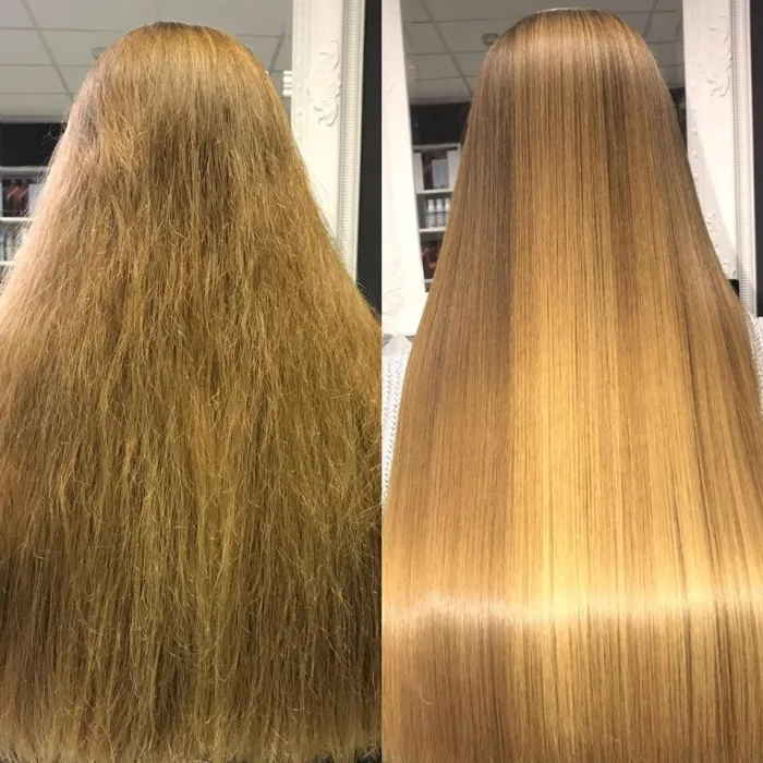 “Ovo radi! Postupak sam napravila uz pomoć supruga prije 2 tjedna, napravila sam malo drugačije nego što je navedeno u priloženim uputama ali nakon keratinskog ravnanja nisam prala kosu do sljedećeg dana. Kosu sam oprala šamponom za njegu kose nakon keratina i osušila. Kosa je sada sjajna i ravna.”